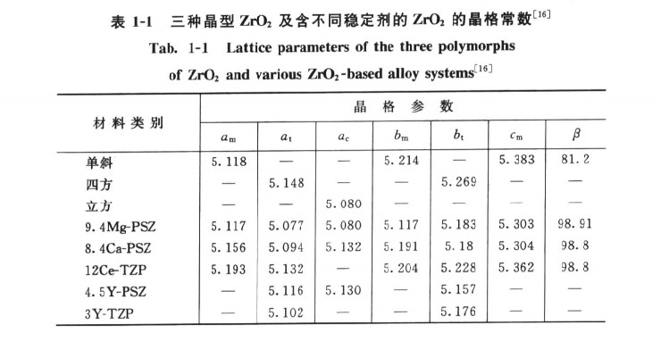 三種晶型的氧化鋯及含不同穩定劑的氧化鋯的晶格常數見表1-1