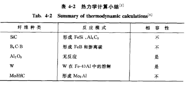 由表4-2可以看出,FeAI與A2O具有較好的適配性能,兩者之間無界面相形成。AAYK. MISRAZ在1990年也分析預測了以FeAl金屬間化合物為基體,陶瓷為增強體復合村料的熱動力學可能反應產物),分析結果見表4-3。上述結果對復合材料的設計也是非常重要的。